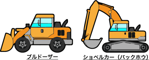 ブルドーザーやショベルカー(バックホウ)、ダンプカーなど土木・建築の作業・工事に使われる機械の総称